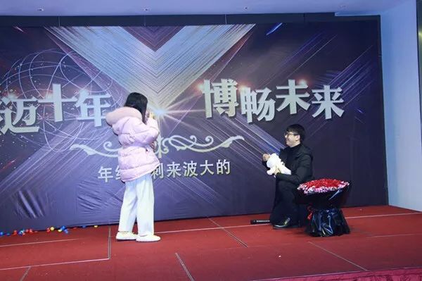 晚上18:28分,年會晚宴隨著主持人的出場拉開序幕,在杰博溫州公司總經(jīng)理、杰博合伙人趙寧先生寄語新年新氣象的精彩祝酒詞中,大家高舉酒杯,歡呼慶祝過去十年的成長與成就,憧憬祝福接下來的十年。隨后,進(jìn)入用餐抽獎環(huán)節(jié),在熱烈的喝彩、掌聲中,各個獎項(xiàng)逐一揭曉,幸運(yùn)兒們激動不已、笑容滿面。晚宴在一場浪漫的求婚中進(jìn)入高潮。他們相識五年、相戀五年,攜手從校園走進(jìn)杰博大家庭,一起努力、共同成長。這一天,在杰博家人的見證下,約定共同開啟美好的明天。