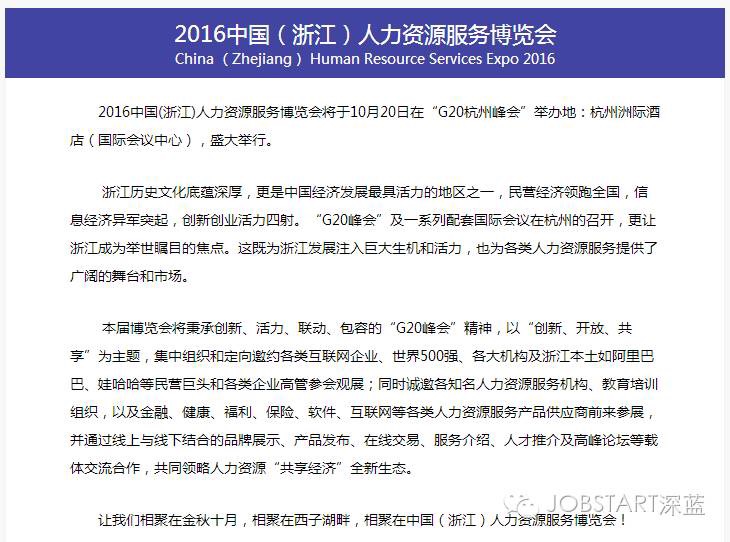 為服務浙江經(jīng)濟社會發(fā)展轉型升級,匯聚更多智力人才,打造人力資源服務高端平臺,10月20日,2016中國(浙江)人力資源服務博覽會將在杭州洲際酒店盛大舉行。
